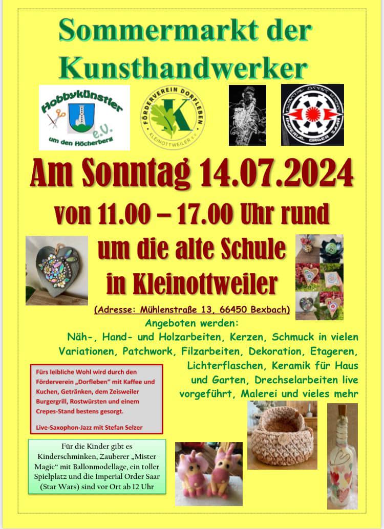 Der Wettergott meinte es gut mit den Hobbyfreunden rund um den Höcherberg und dem Förderverein Dorfleben Kleinottweiler die zum Sommermarkt der Kunsthandwerker rund um die ehemalige Schule in Kleinottweiler einluden . Die Hobbykünstlerinnen und Hobbykünstler, deren Gruppe in diesem Jahr seit zehn Jahren besteht, boten am Sonntag, 14. Juli, den zahlreichen Besucherinnen und Besuchern ein breitgefächertes Sortiment aus selbstgefertigem Kunsthandwerk, vom Tuschegemälde über Holzkunst und Schmuck über Haushaltsutensilien über Blumen und Filzarbeiten und Pflanzen bis hin zu kunstvoll gestalteten Milchtütchen. Der Zauberer Mr. Magic begeisterte die Kinder unter anderem mit Luftballonfiguren, der Saxofonist Stefan Schmelzer unterhielt mit entspannender Begleitmusik, Doris Selzer bot Kinderschminken an. Sandra Bauer, die Vorsitzende der Hobbykünstler, überreichte in Begleitung der Star-Wars-Gruppe "Imperial Order" eine 900 Euro Spende an das Kinderhospiz- und Palliativteam Saar. Es handelt sich um den Erlös Tombola der Adventsausstellung der Hobbykünstler in 2023 Der Förderverein Dorfleben sorgte für Getränke, Würstchen, Kaffee und Kuchen... leckere Burger gab es am Zeisweiler Grill. dh/Fotos: Daniel Heintz